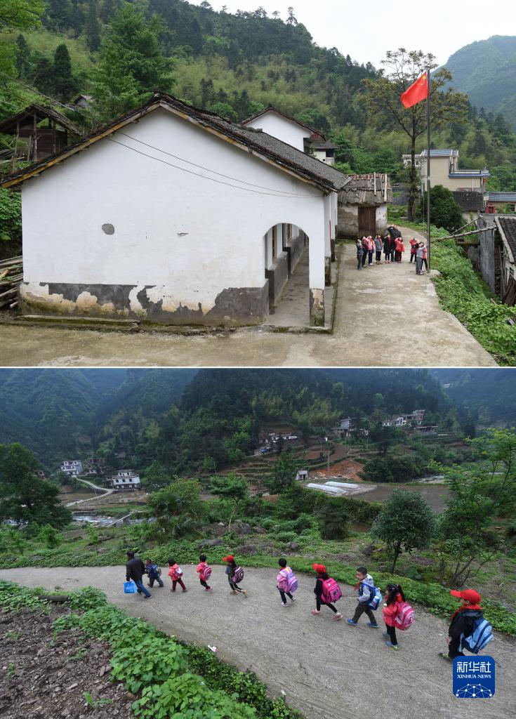 拼版照片:廣西全州縣蕉江瑤族鄉大源村委苦馬田教學(xué)點(diǎn)的盧加紅老師和學(xué)生一起升國旗(上圖),盧加紅老師中午放學(xué)后護送學(xué)生回家(下圖)(2016年4月28日攝)。當時(shí),盧加紅是苦馬田教學(xué)點(diǎn)唯一的老師。