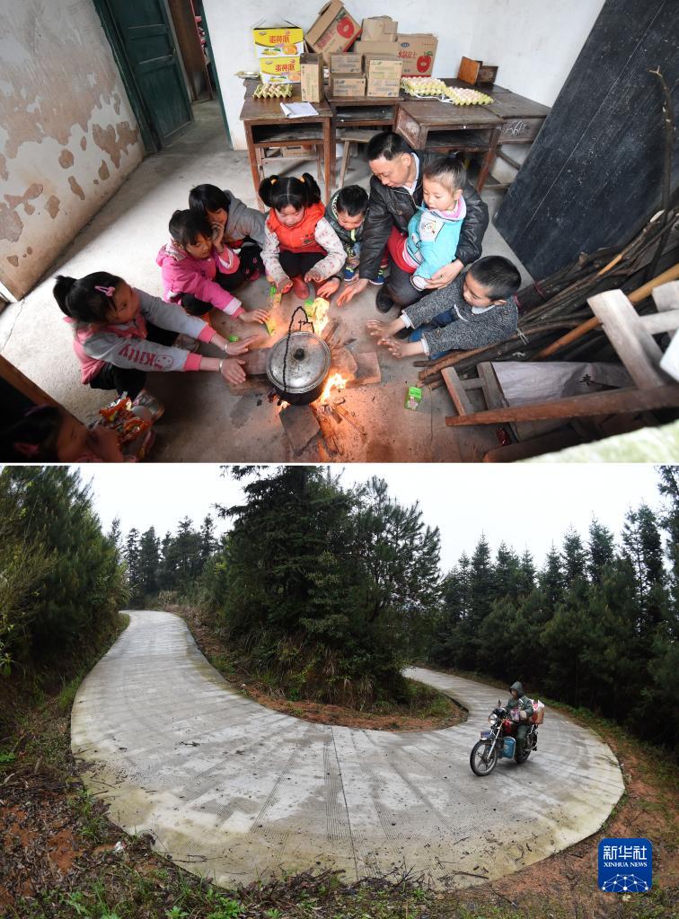 拼版照片:廣西灌陽(yáng)縣洞井瑤族鄉野豬殿村小學(xué)的周運雄老師(右三)和學(xué)生邊烤火邊煮雞蛋(上圖),周運雄老師騎摩托車(chē)載著(zhù)學(xué)生營(yíng)養餐趕回學(xué)校(下圖)(2016年3月23日攝)。時(shí)年58歲的周運雄是野豬殿村小學(xué)校長(cháng),也是學(xué)校的兩名老師之一。他常常要騎摩托車(chē)翻越25公里山路到鄉政府領(lǐng)取學(xué)生營(yíng)養餐食材。
