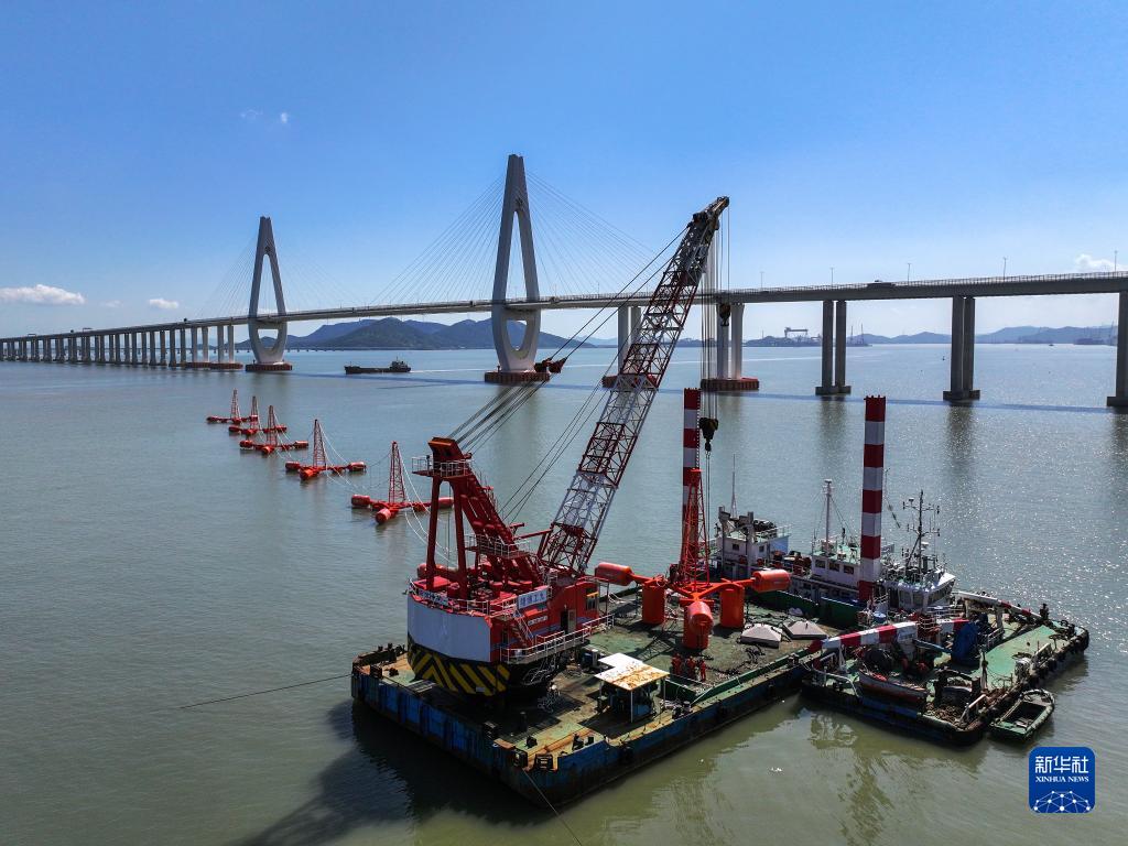 9月10日,一艘工程船在舟山市定海區馬目海邊為舟岱大橋南通航孔橋安裝防船舶撞擊系統(無(wú)人機照片)。