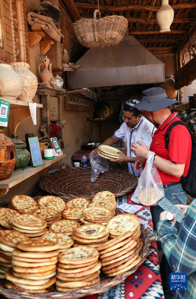 在新疆喀什古城景區“爺爺的爺爺的爸爸的馕”打馕店,游客在買(mǎi)馕(9月7日攝)。