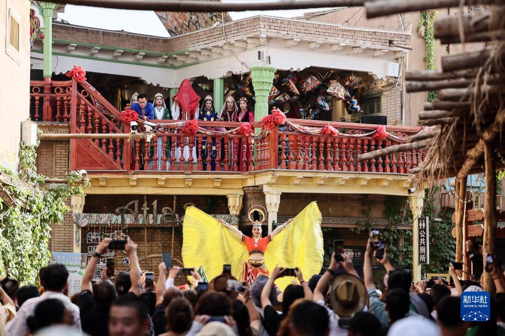 在新疆喀什古城景區內,演員在表演文藝節目(9月7日攝)。