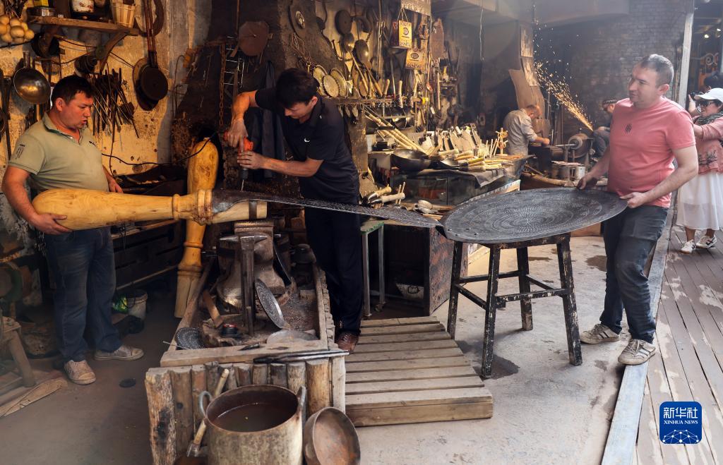 在新疆喀什古城景區鐵業(yè)公社內,手藝人在制作鐵器(9月6日攝)。