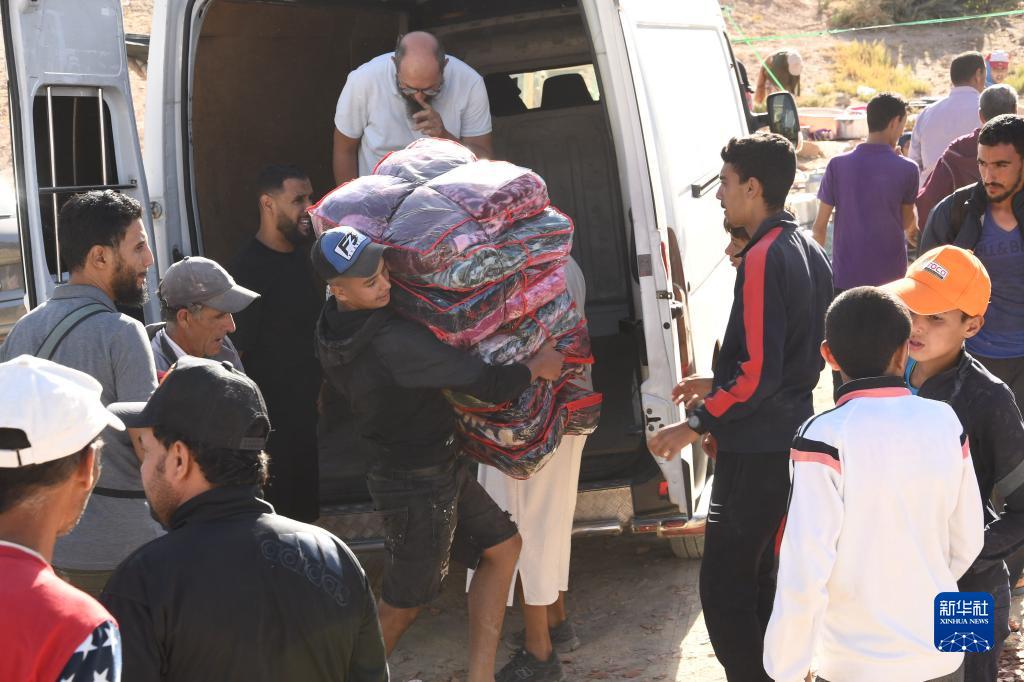 9月10日,在摩洛哥震中附近的艾茲魯村,人們搬運救援物資。