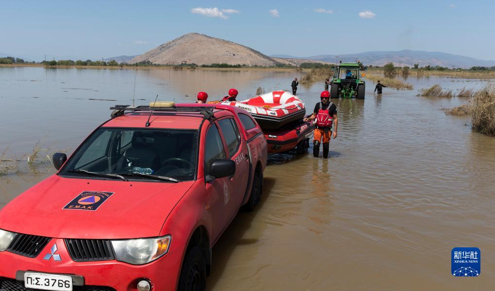 9月10日,在希臘中部色薩利地區,救援人員攜帶橡皮艇參與救援。
