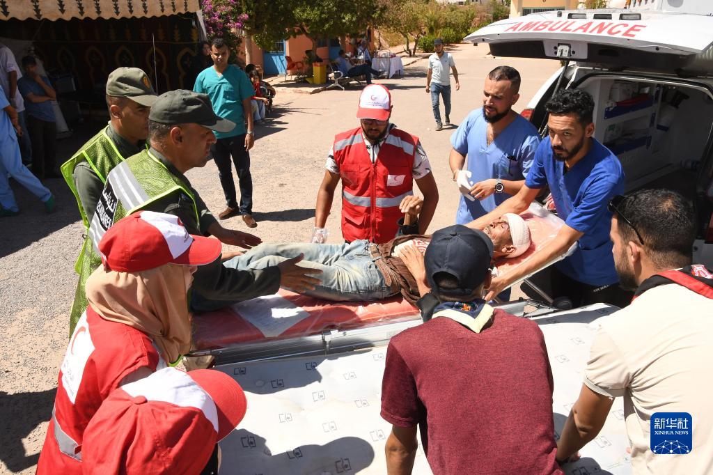 9月10日,在摩洛哥震中附近的艾茲魯村,救援人員將傷者抬上救護車(chē)。