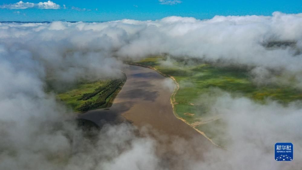 這是8月22日清晨在四川省阿壩藏族羌族自治州若爾蓋縣唐克鎮拍攝的黃河九曲第一灣景色(無(wú)人機照片)。
