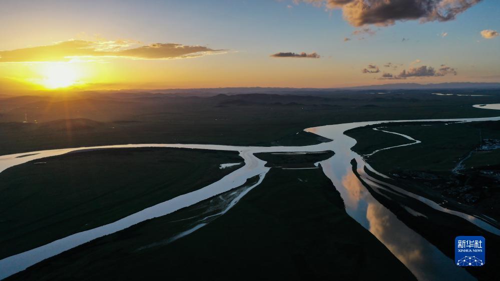 這是8月21日在四川省阿壩藏族羌族自治州若爾蓋縣唐克鎮拍攝的黃河九曲第一灣落日(無(wú)人機照片)。