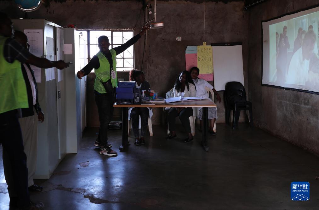 7月26日,瓜達吉亞與同事在莫桑比克馬普托省戈巴村學(xué)校查看中國援助的投影電視設備。
