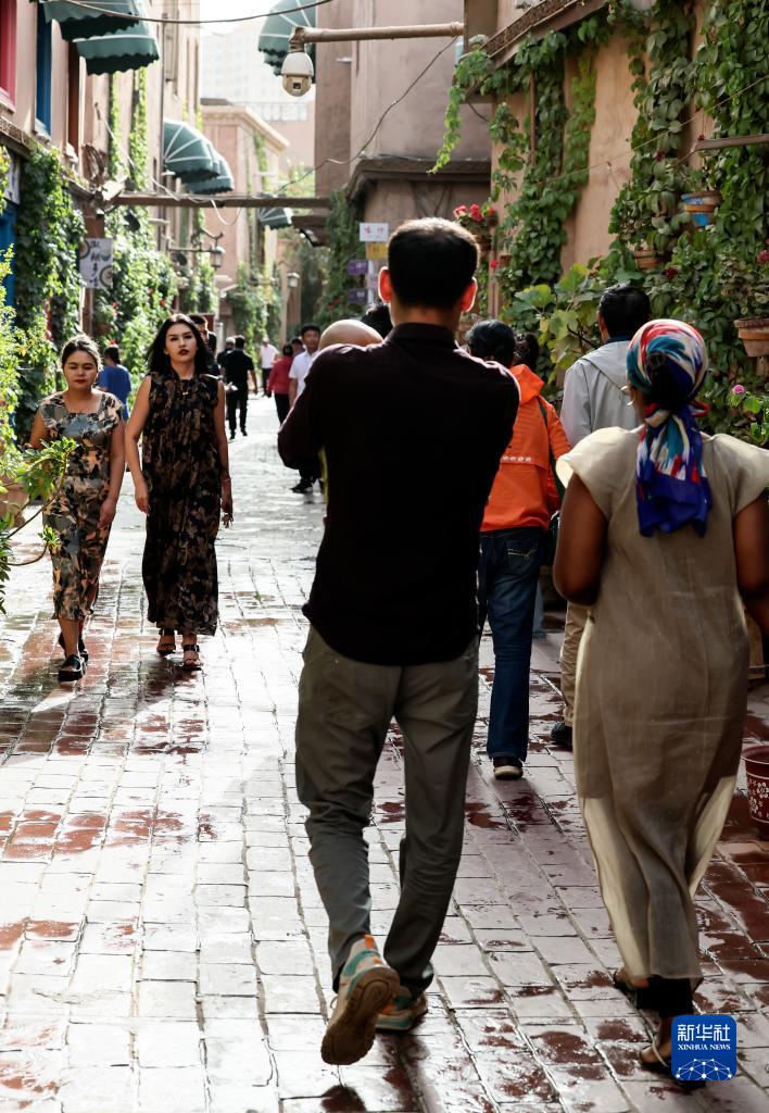 迪力夏提(前左)抱著(zhù)孩子和海迪雅走在喀什古城景區的巷道內(9月7日攝)。
