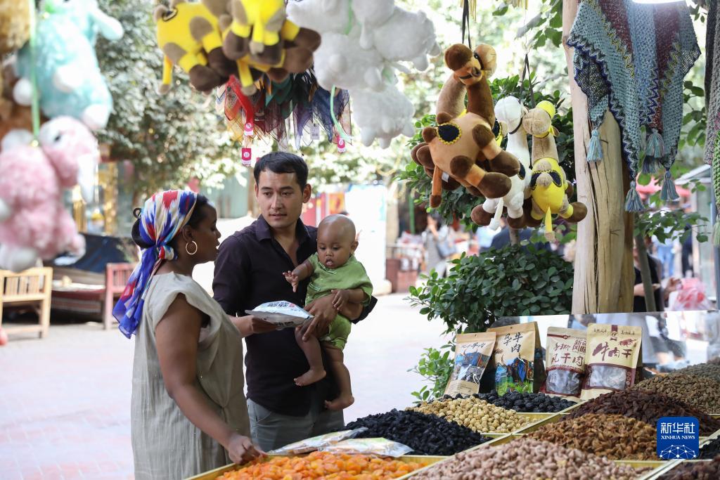 迪力夏提抱著(zhù)孩子和海迪雅在喀什古城景區的一家店鋪前挑選美食(9月7日攝)。