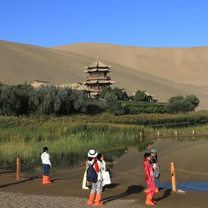 9月11日,游客在甘肅省敦煌市鳴沙山月牙泉景區游覽。