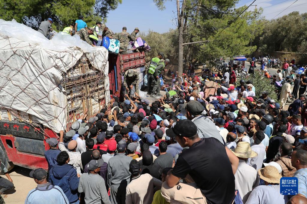 9月11日,救援人員在摩洛哥馬拉喀什南部的艾米茲米茲村分發(fā)救災物資。