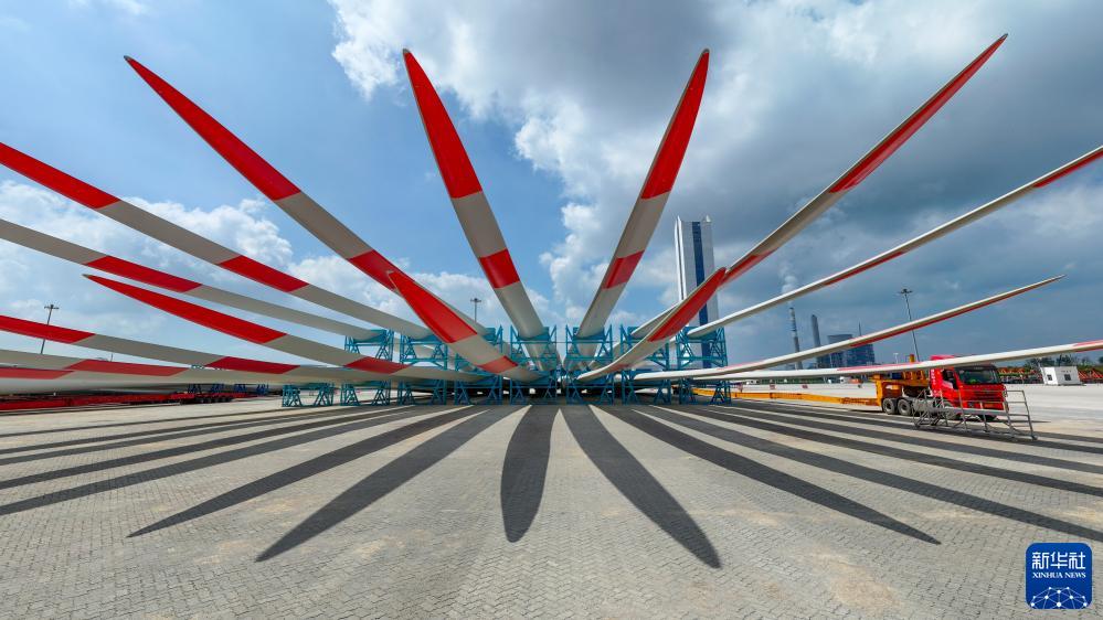 一批風(fēng)電葉片在江蘇鹽城港射陽(yáng)港區碼頭等待運輸(2023年9月8日攝,無(wú)人機照片)。