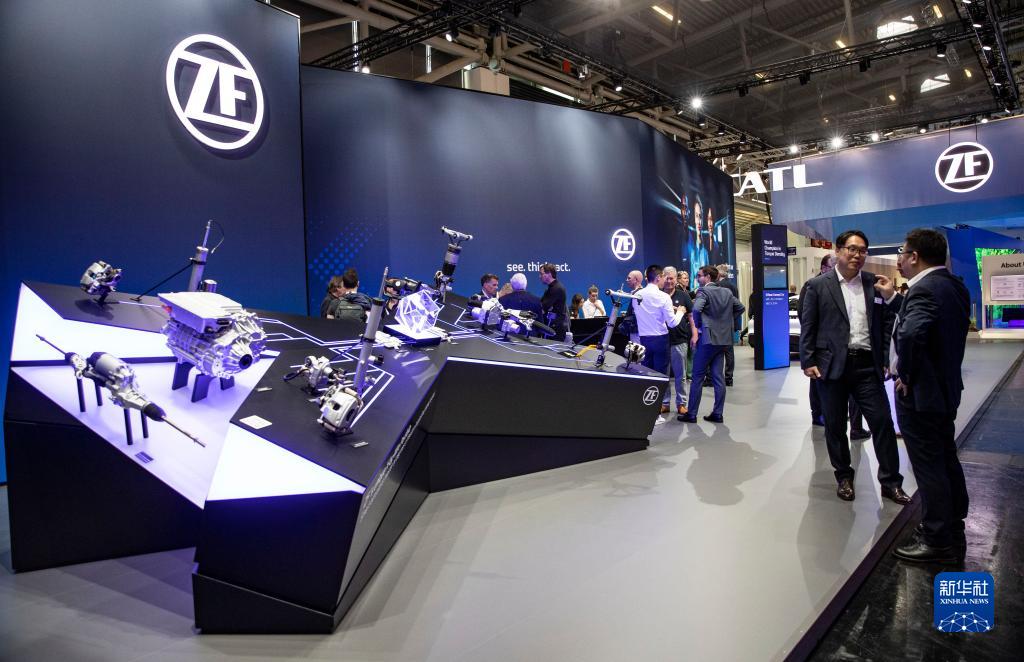 這是9月4日在德國慕尼黑舉行的2023年德國國際汽車(chē)及智慧出行博覽會(huì )媒體預展上拍攝的采埃孚展區。