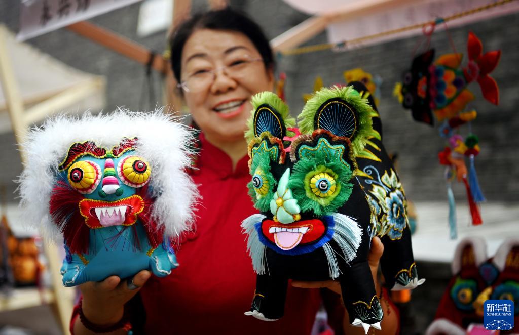9月12日,西安市新城區“遇見(jiàn)城墻·非遺韻”非遺集市上,王氏布藝傳承人王海燕在展示自己的布藝作品。