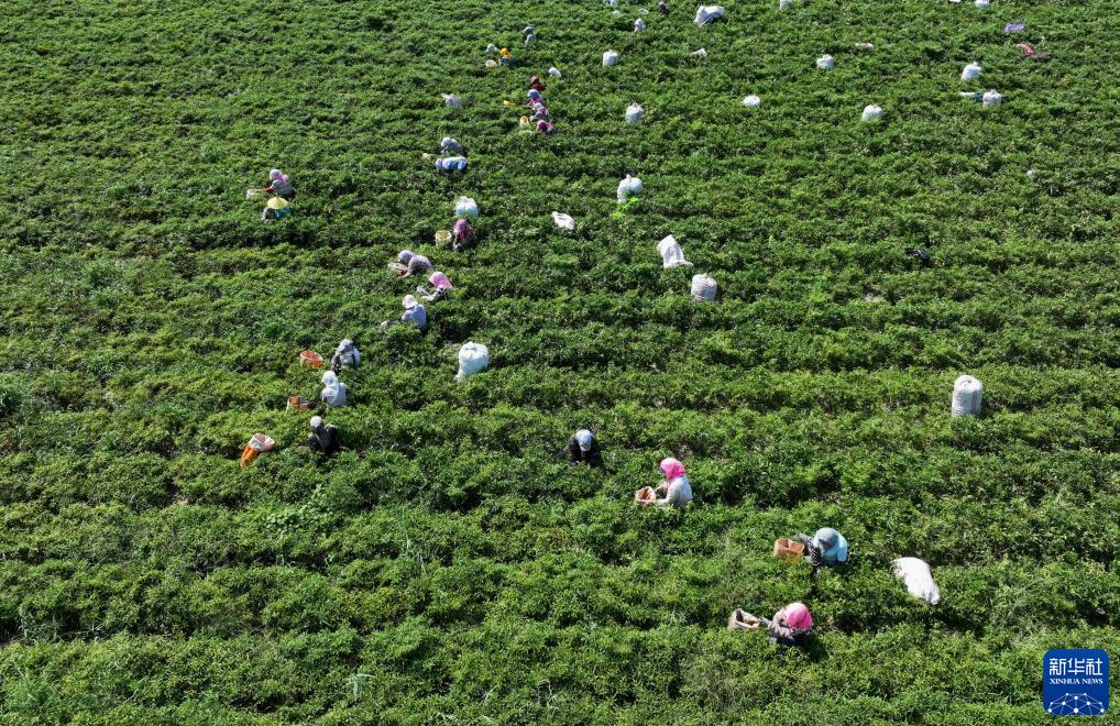 9月12日,唐山市豐南區東田莊鄉大吳莊戶(hù)村的農民在田間采收辣椒(無(wú)人機照片)。