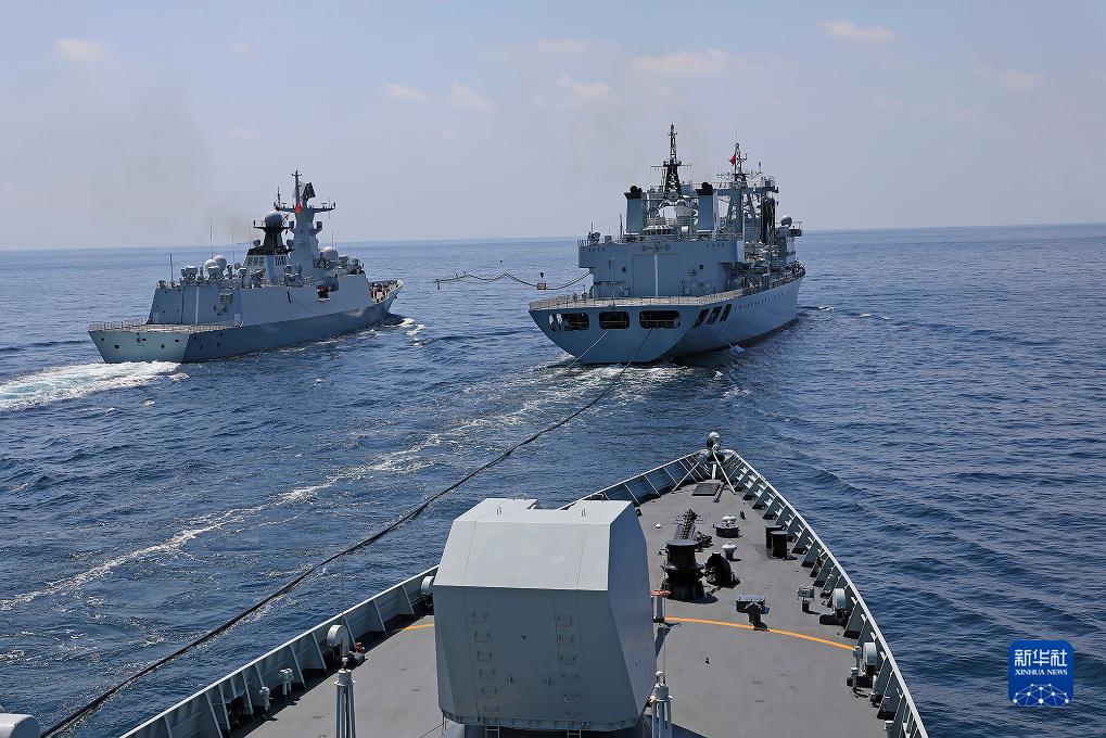 中國海軍第45批護航編隊在任務(wù)準備期間組織航行補給訓練(8月24日攝)。