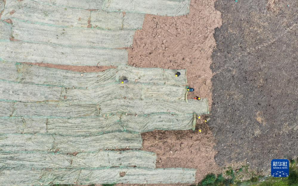 在若爾蓋縣達扎寺鎮多瑪村廢棄礦山治理點(diǎn),工人在邊坡上鋪椰絲毯(8月23日攝,無(wú)人機照片)。