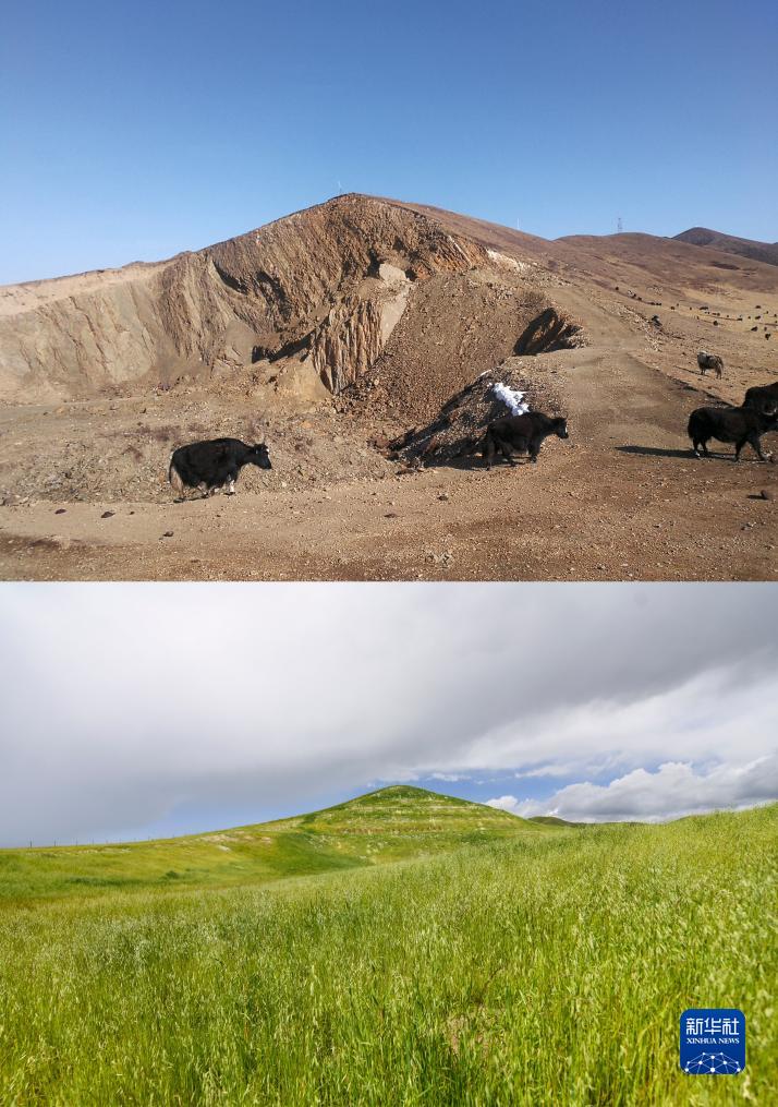 拼版照片:上圖為若爾蓋縣唐克鎮嘎?tīng)柆敶逯卫砬暗钠旅妫?月8日攝,若爾蓋縣自然資源局供圖),下圖為嘎?tīng)柆敶逯卫砗蟮钠旅妫ㄐ氯A社記者王曦8月23日攝)。