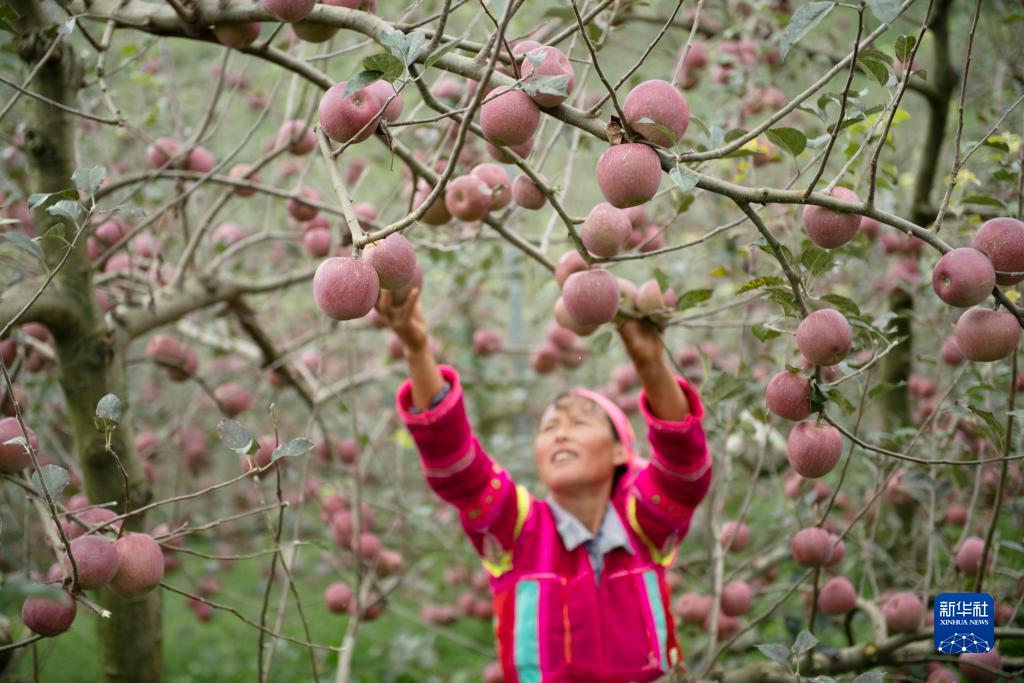 9月12日,云南省文山州硯山縣阿舍彝族鄉黑山村的果農在采摘蘋(píng)果。
