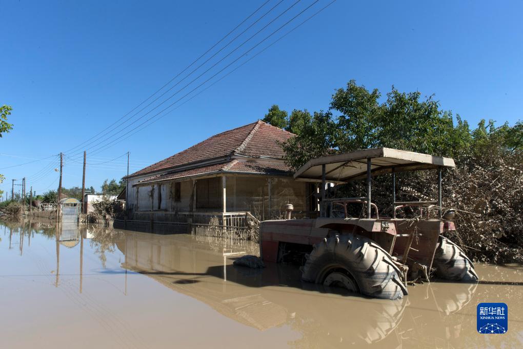 9月12日,希臘中部卡爾季察地區的一處村莊道路淹沒(méi)在水中。