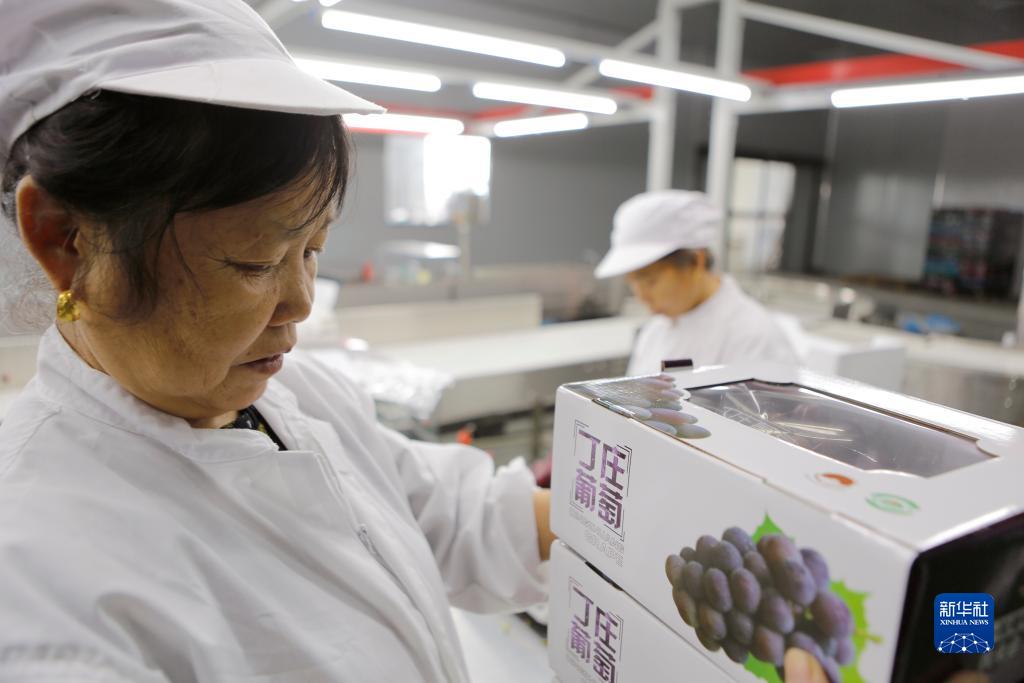9月12日,句容市丁莊村葡萄合作聯(lián)社分揀中心的工作人員在整理裝箱的葡萄。