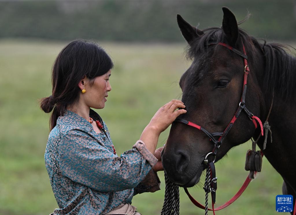 8月17日,在青海省黃南藏族自治州河南蒙古族自治縣多松鄉多松村,扎西曲培的妻子斗格吉在照料一匹馬。新華社記者 張龍 攝