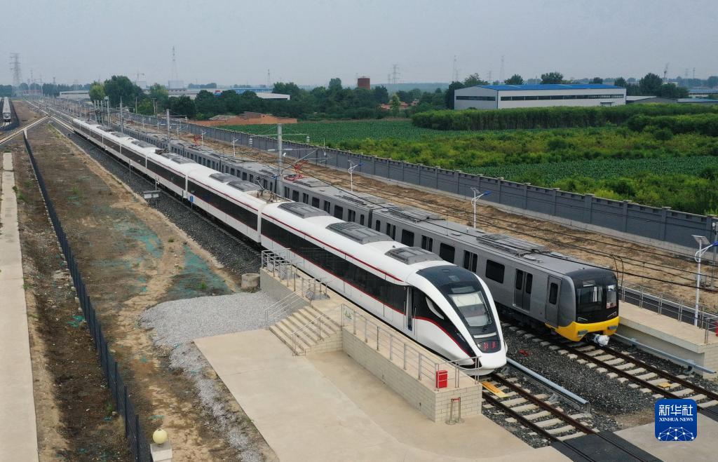 7月27日在河北省保定市滿(mǎn)城區河北京車(chē)智能制造基地試車(chē)場(chǎng)拍攝的市域時(shí)速200公里的動(dòng)車(chē)組列車(chē)(左)(無(wú)人機照片)。