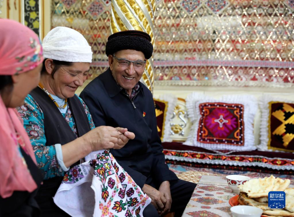 9月4日,巴依卡老人(右)在家中休息,他的老伴帕熱扎·加依克(中)在繡制靠墊套。新華社記者 程婷婷 攝