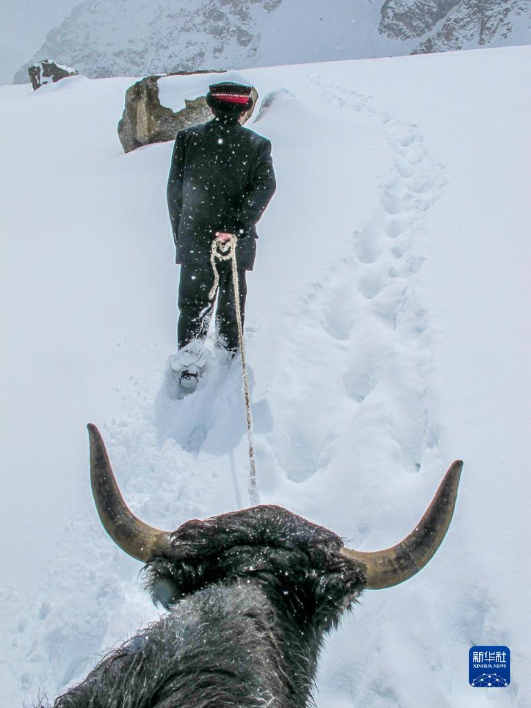 2010年9月25日,拉齊尼牽著(zhù)牦牛踏著(zhù)厚厚的積雪在邊境線(xiàn)上巡邏。新華社發(fā)(王烈 攝)