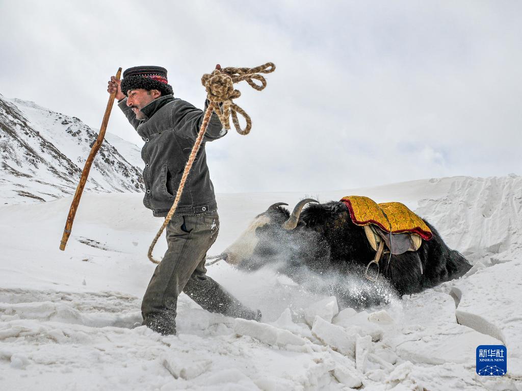 2009年3月6日,拉齊尼牽著(zhù)牦牛踏著(zhù)厚厚的積雪在邊境線(xiàn)上巡邏。新華社發(fā)(王烈 攝)
