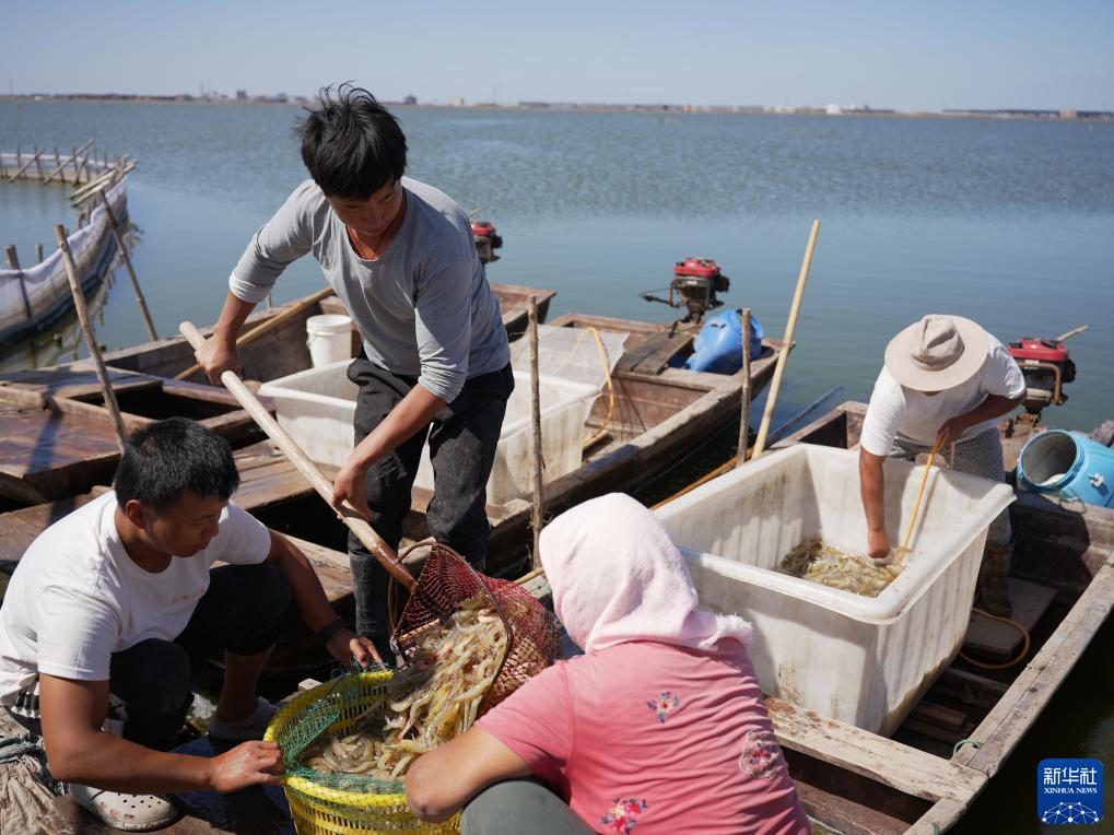 9月13日,養殖戶(hù)在河北省滄州市海興縣小山鄉蔡家莊村養殖蝦池收獲對蝦。