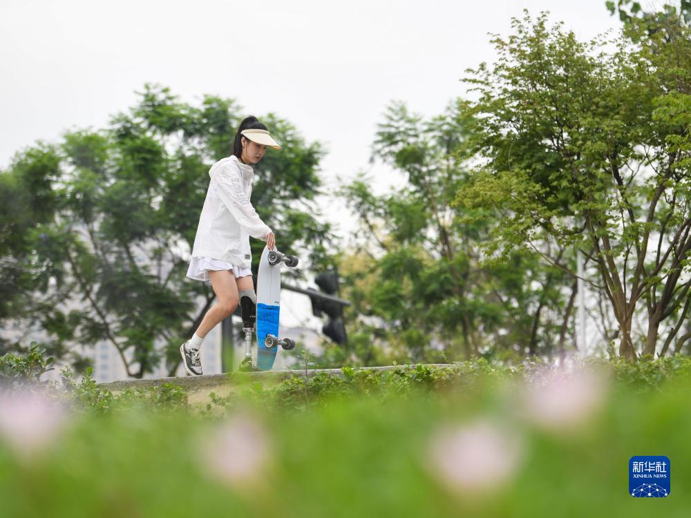??? 在成都市錦江區輕極限運動(dòng)公園,胡月在練習滑板(6月20日攝)。新華社記者 王曦 攝