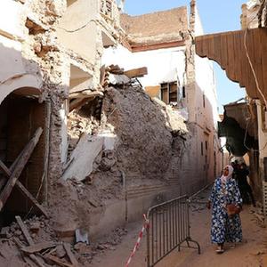 9月13日,人們經(jīng)過(guò)摩洛哥馬拉喀什老城的一處震后受損建筑。