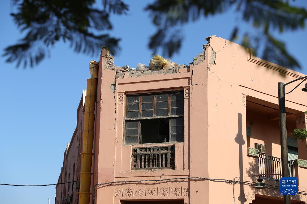 這是9月13日在摩洛哥馬拉喀什老城拍攝的一處震后受損建筑。