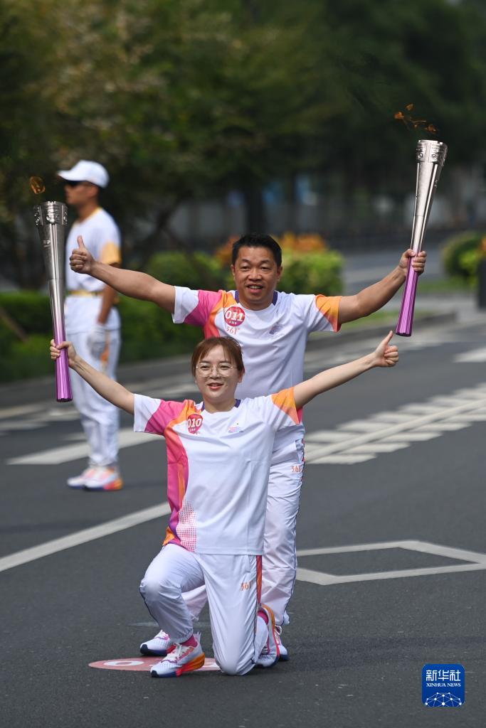 9月14日,火炬手繆雨(下)、陸景亮在火炬傳遞中。