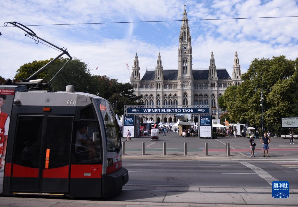 9月13日,一輛電車(chē)從奧地利維也納電動(dòng)汽車(chē)日活動(dòng)現場(chǎng)前經(jīng)過(guò)。