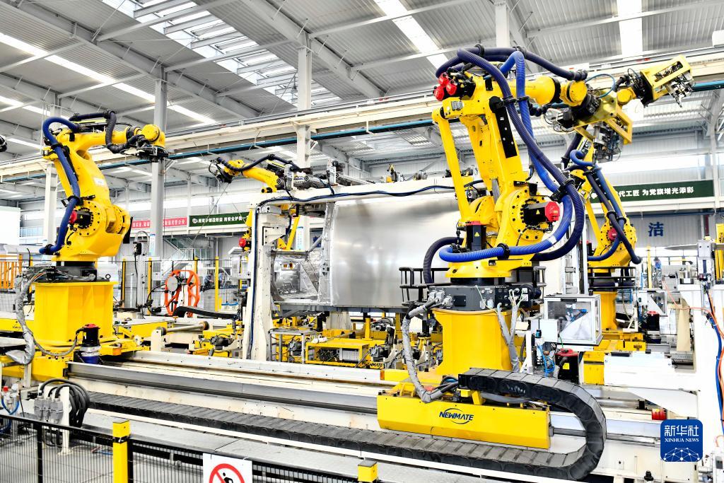 9月13日,在山東鄒平魏橋輕量化基地宏奧全鋁車(chē)身集成生產(chǎn)車(chē)間,工業(yè)機器人在流水線(xiàn)上作業(yè)。