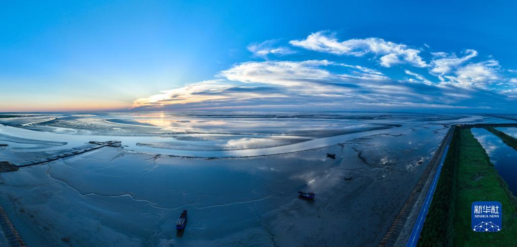東臺條子泥濕地日出時(shí)分(2023年9月1日攝,無(wú)人機照片)。新華社記者 季春鵬 攝