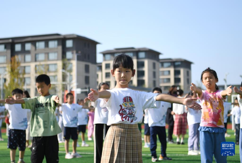 9月13日,雄安史家胡同小學(xué)學(xué)生在操場(chǎng)上做體操。