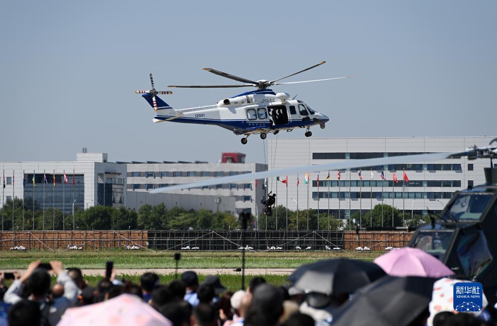 9月14日,天津市公安局警務(wù)航空總隊直升機在開(kāi)幕式上進(jìn)行飛行表演。