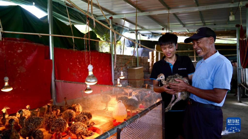9月13日,吳錦彪(左)給合作社成員賴(lài)祥森介紹鴕鳥(niǎo)養殖知識。新華社記者 胡晨歡 攝