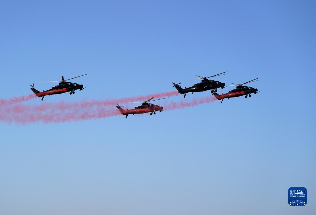 9月14日,在第六屆中國天津國際直升機博覽會(huì )開(kāi)幕式上,陸軍“風(fēng)雷”飛行表演隊直-10武裝直升機進(jìn)行飛行表演。