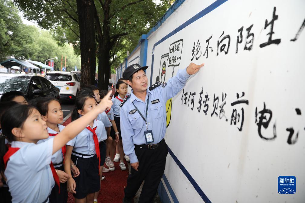 9月14日,浙江省東陽(yáng)市公安局江北派出所的輔警向江北二小的學(xué)生講解網(wǎng)絡(luò )安全知識。
