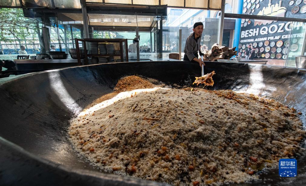 9月14日,在烏茲別克斯坦首都塔什干,中亞抓飯中心主廚制作抓飯。