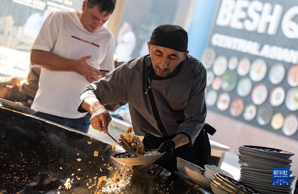 9月14日,在烏茲別克斯坦首都塔什干,中亞抓飯中心主廚盛取做好的抓飯。