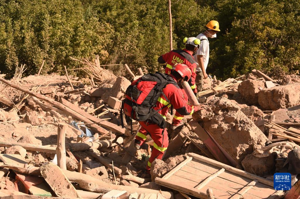 9月14日,救援人員在位于摩洛哥豪茲省的伊姆利勒村的地震廢墟上搜救。