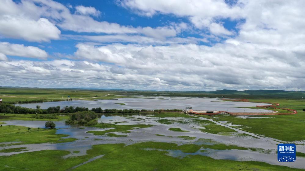 這是瑪曲縣河曲馬場(chǎng)的濕地草原景色(7月5日攝,無(wú)人機照片)。