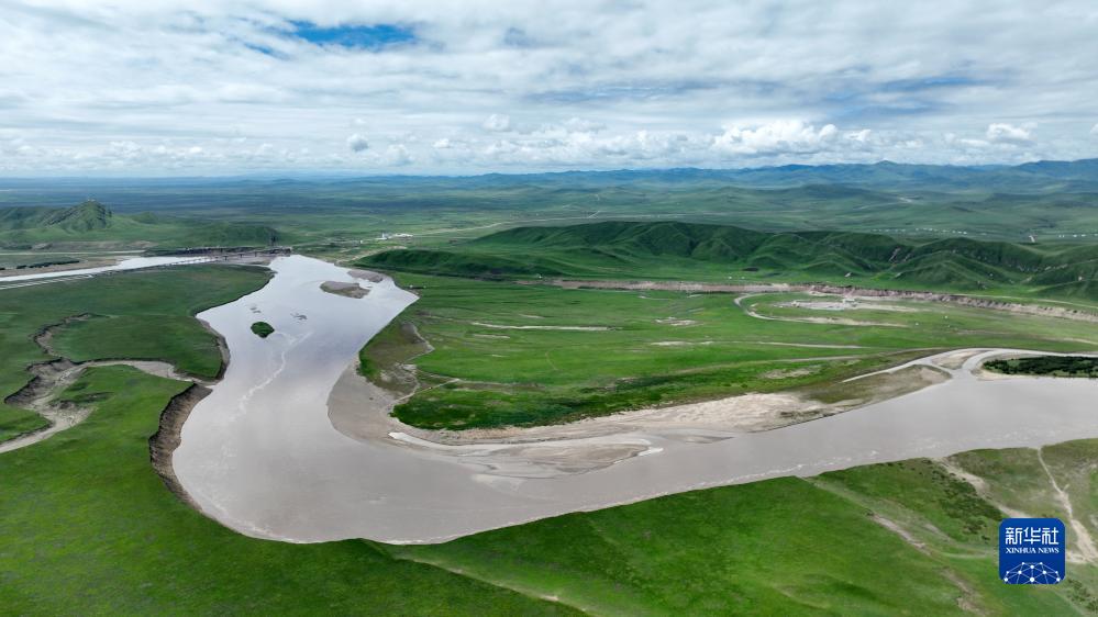 瑪曲縣黃河兩岸綠意盎然(7月6日攝,無(wú)人機照片)。