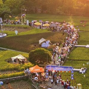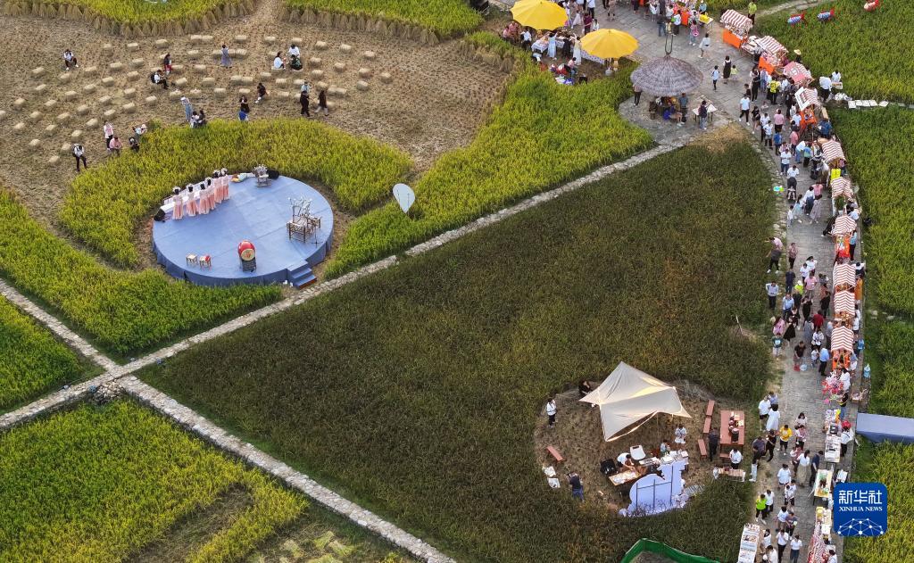 當日,湖南省張家界市武陵源區黃龍洞景區舉辦“田園市集慶秋收”活動(dòng)。金黃的稻田旁,游人可欣賞民俗文化節目,還可品嘗特色小吃、購買(mǎi)當地特色農產(chǎn)品和手工藝品,感受豐收的喜悅。